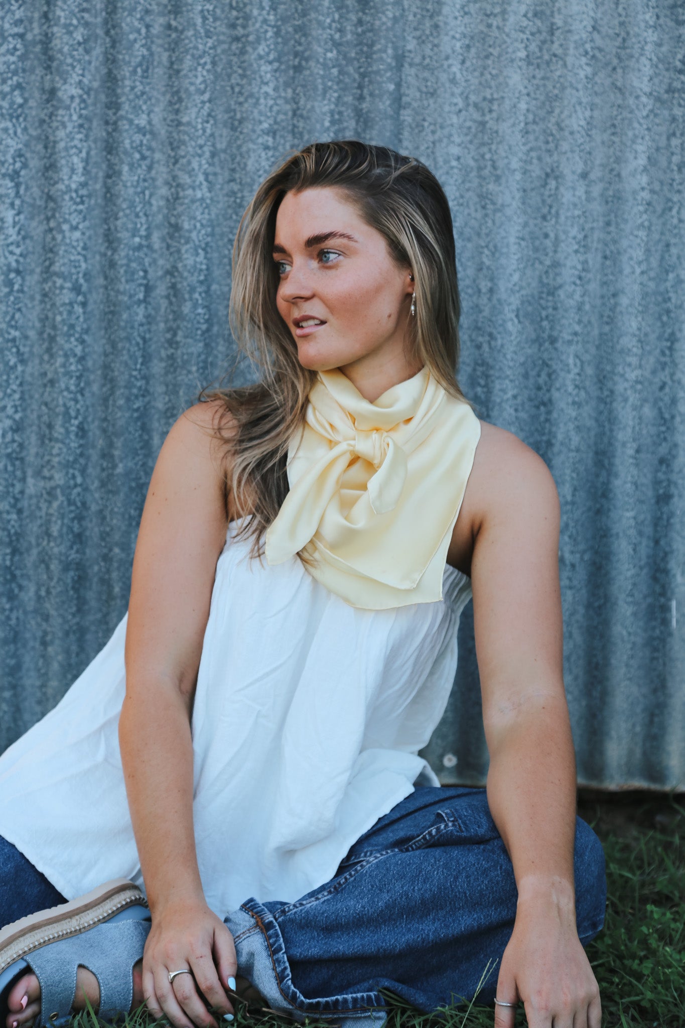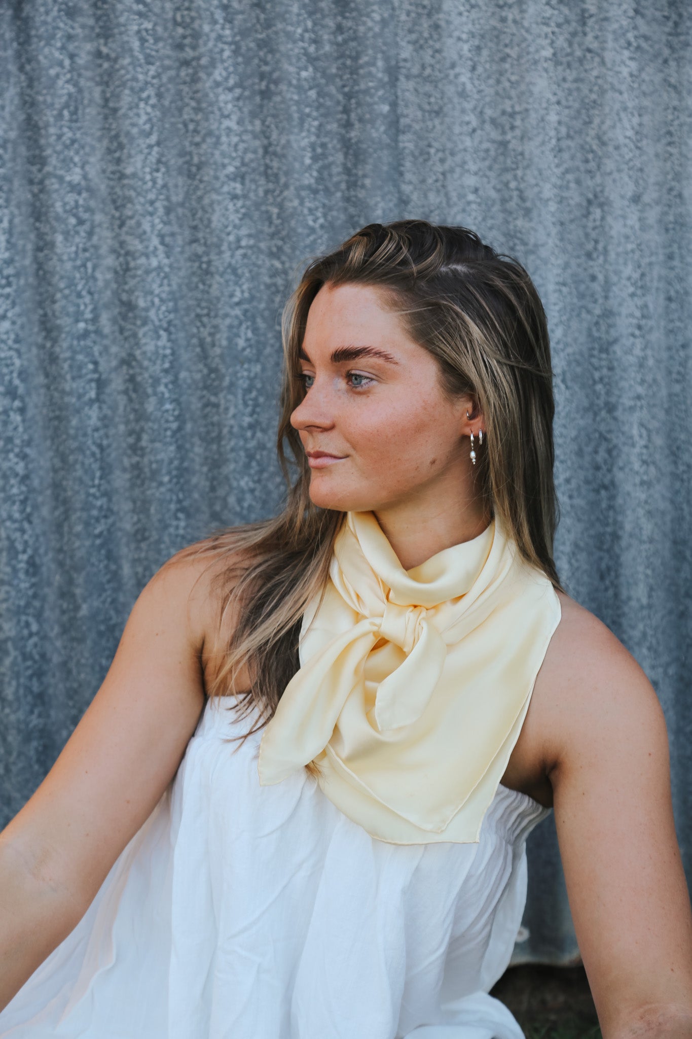 Soft, creamy and beautifully refined, the Buttermilk Rag is designed to bring a touch of quiet luxury to your outfit. Its warm ivory tone feels elevated yet effortless. With its smooth silk texture and classic 90 x 90 size, this piece ties and drapes with grace.